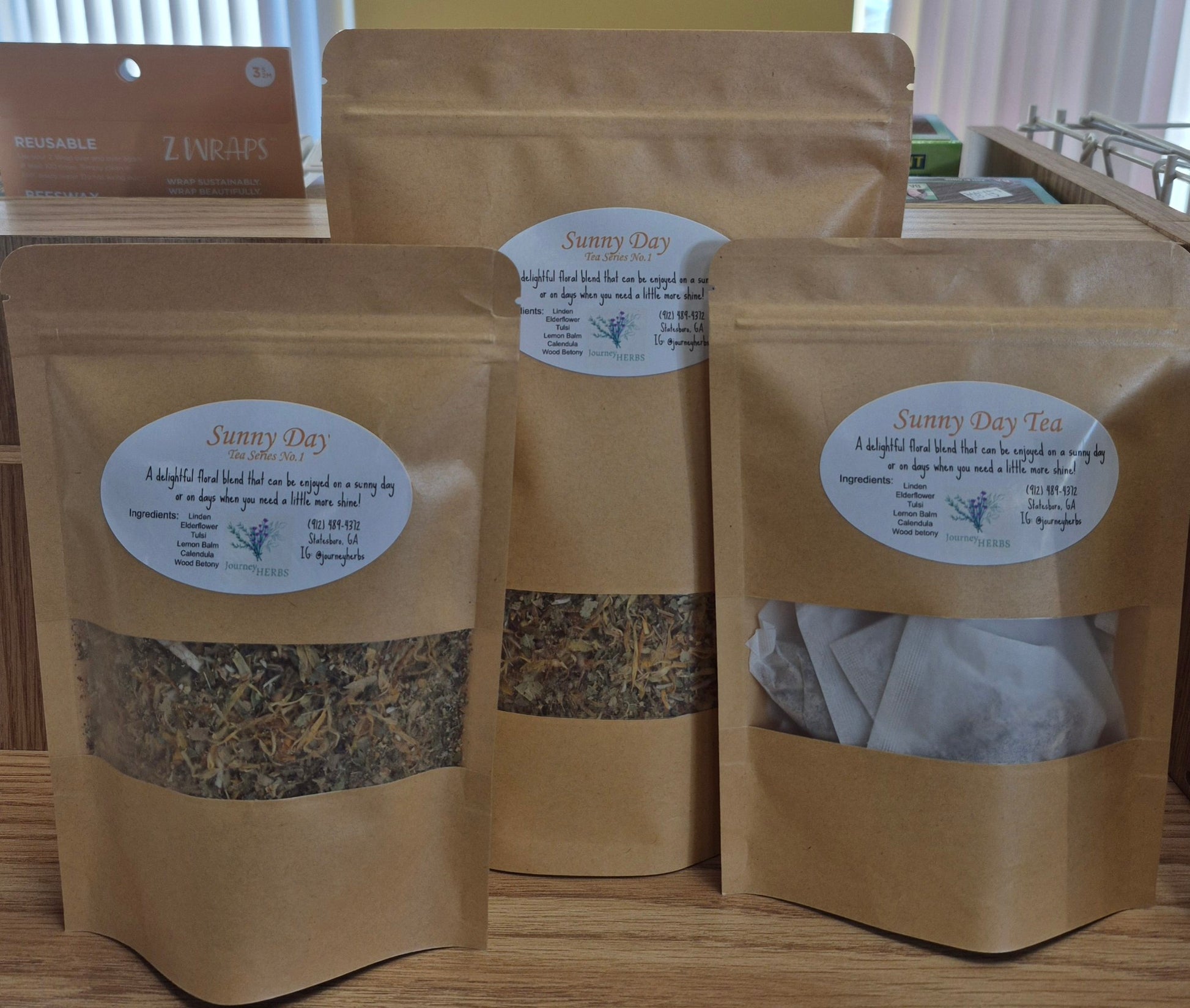 Impress your taste buds with Fine Thymes Sunny Day Tea No.1! This delightful blend features linden, elderflower, tulsi, lemon Balm, calendula, and wood betony, all organically sourced. Savor the calming and refreshing benefits of this floral infusion.