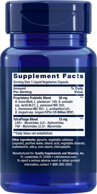 FLORASSIST® Balance delivers seven probiotic strains: Bifidobacterium breve Bbr8; Lactobacillus plantarum 14D; B. animalis ssp. lactis BLC1; L. paracasei IMC 502; L. rhamnosus IMC 501; L. acidophilus LA1; B. longum ssp. longum SP54. Per capsule, there is a total of 15 billion colony forming units (or CFUs) of the proprietary blend of these probiotic strains. Plus, the FLORASSIST® probiotic blend is formulated to work with the TetraPhage blend.7