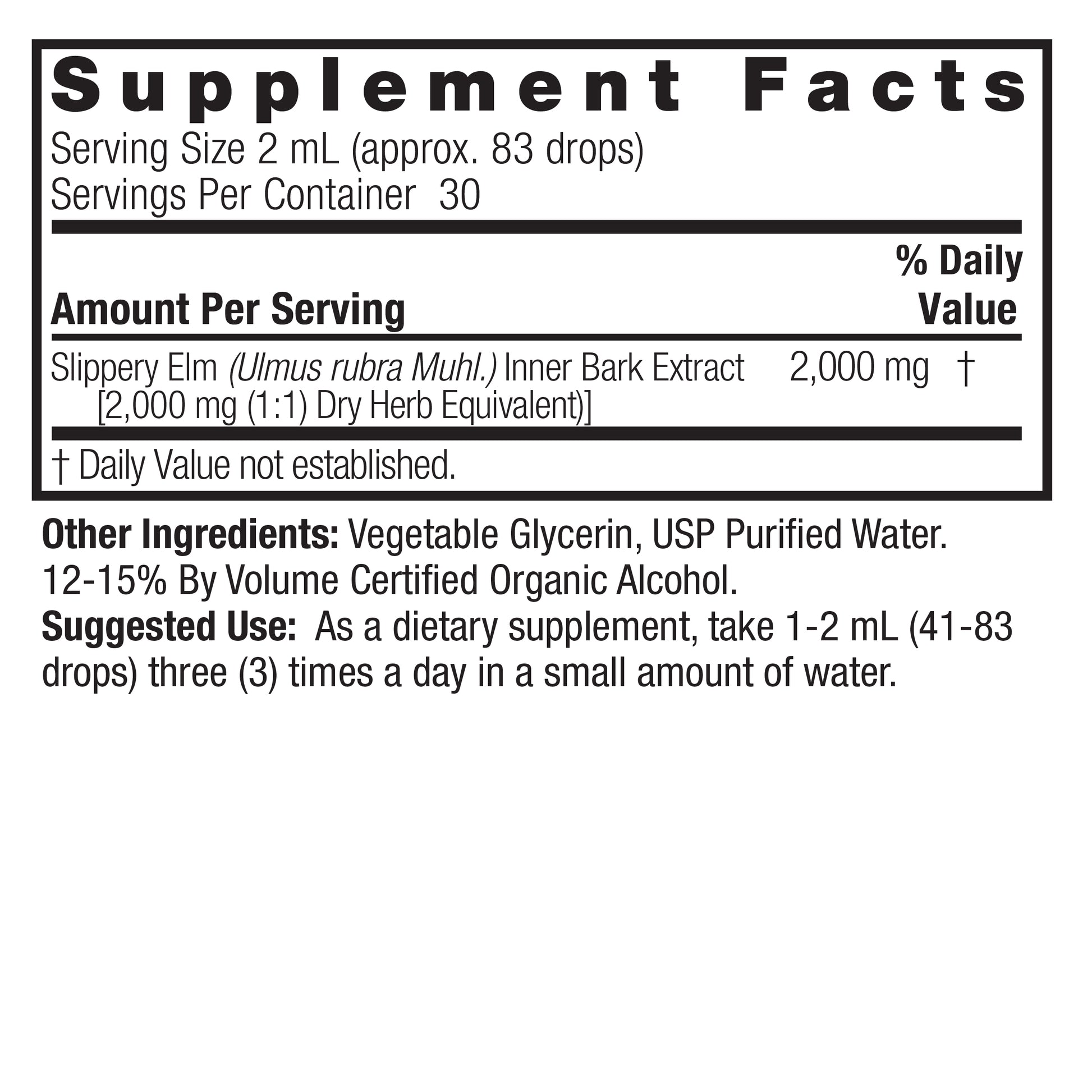 Liquid Slippery Elm Bark promotes overall health*. As a demulcent, Slippery Elm Extract supports soothing action for the throat, the digestive tract, and other mucous membranes in the body.