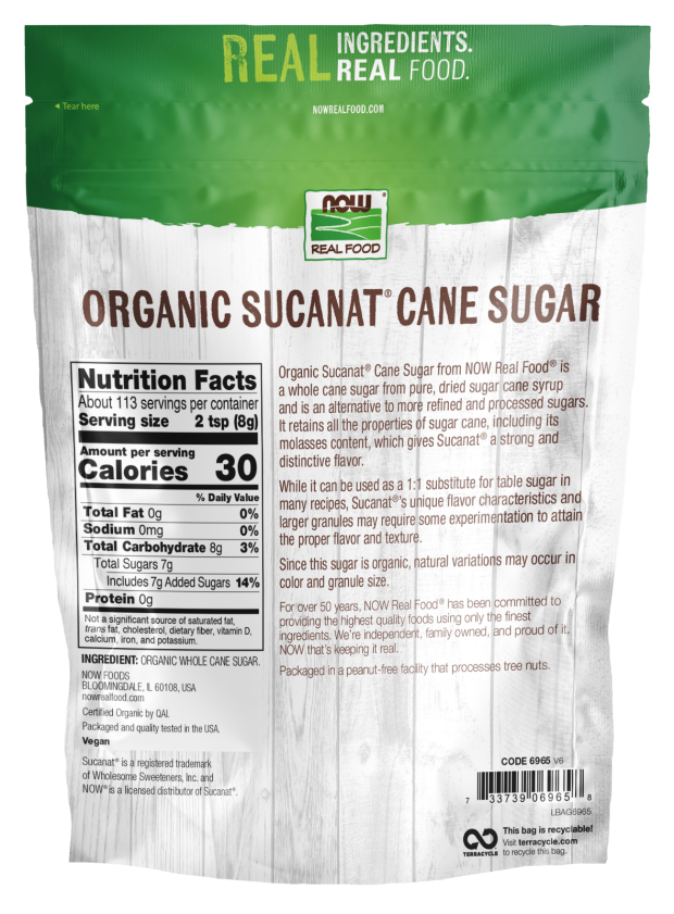 Organic Sucanat® Cane Sugar from NOW Real Food® is a whole cane sugar from pure, dried sugar cane syrup and is an alternative to more refined and processed sugars. It retains all the properties of sugar cane, including its molasses content, which gives Sucanat® a strong and distinctive flavor.