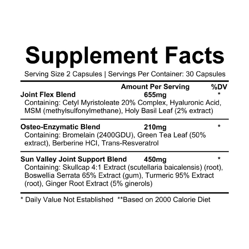 Trans-Resveratrol, Bromelain, Hyaluronic Acid, Holy Basil Leaf, Cetyl Myristoleate, MSM,