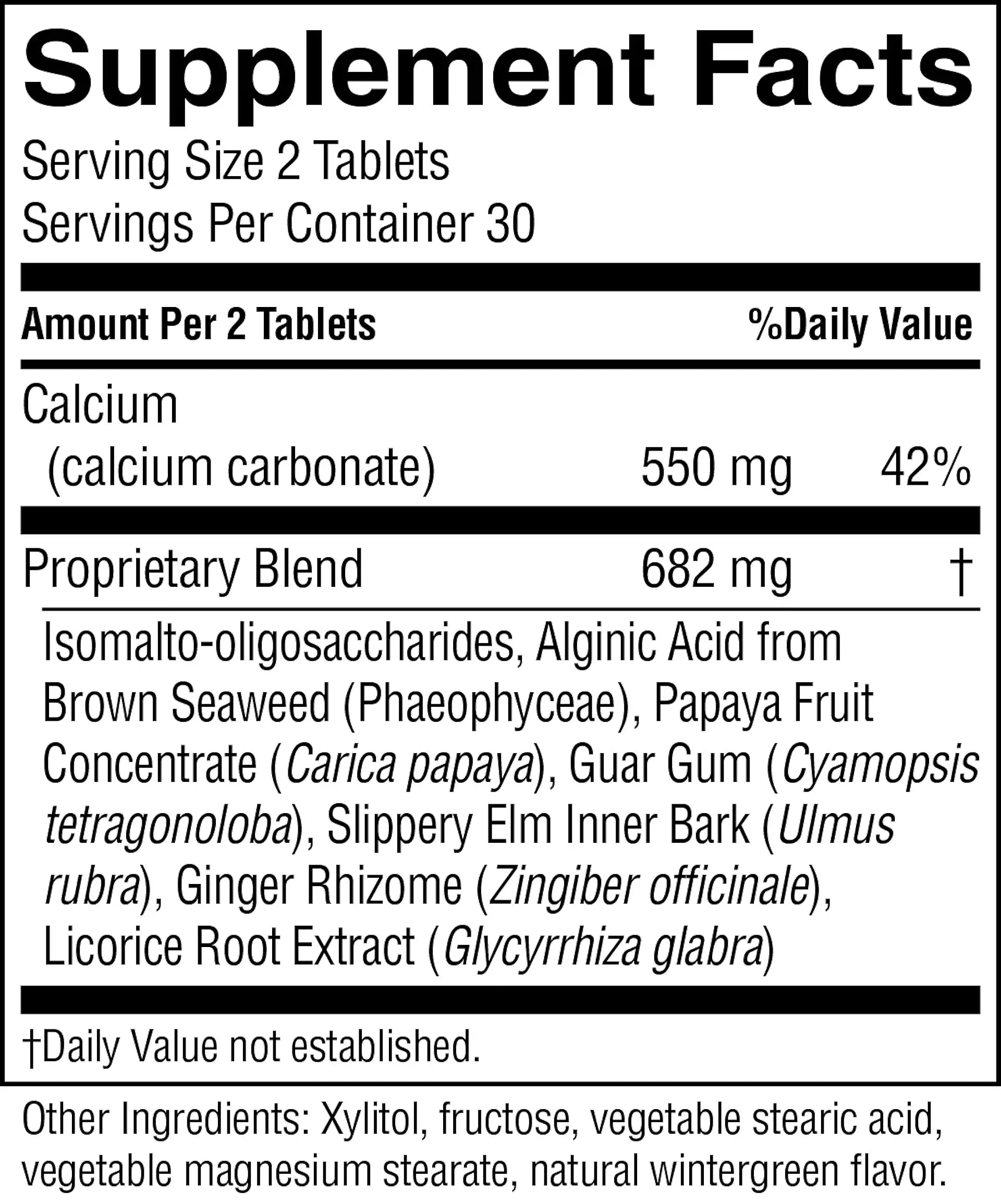 The unique blend of slippery elm, ginger, papaya, licorice, calcium, and sodium alginate works natural wonders for your digestive peace.