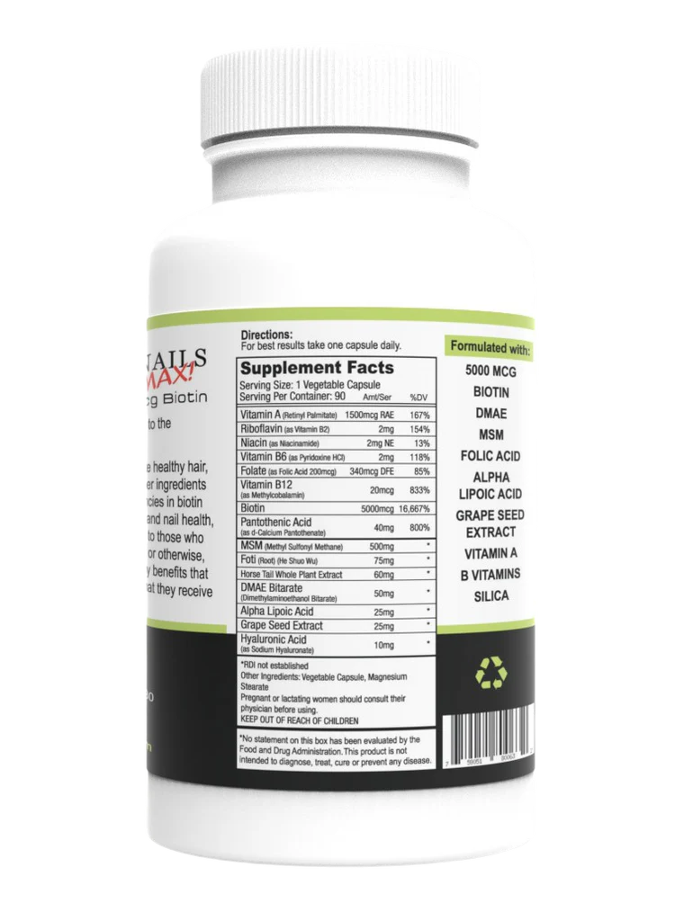 Formulated with double strength 5000mcgs of high potency biotin, MSM, horsetail extract, fo-ti root, DMAE, and grape seed extract to promote fuller hair, stronger nails, and glowing skin. This multi-effective formula helps increase collagen production to support hair, skin, and nail health.