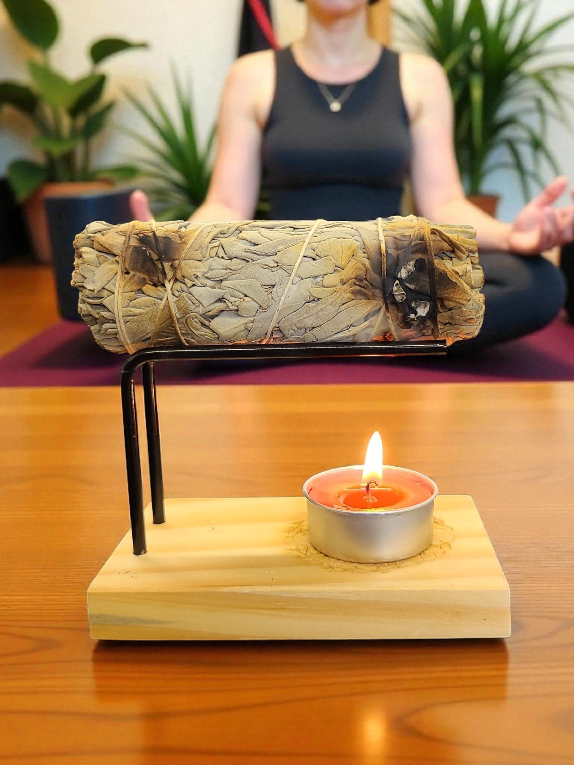 Optionally, place a tea light candle beneath the smudge stick to help it smolder slowly, releasing the natural calming fragrance from the oils within the stick.